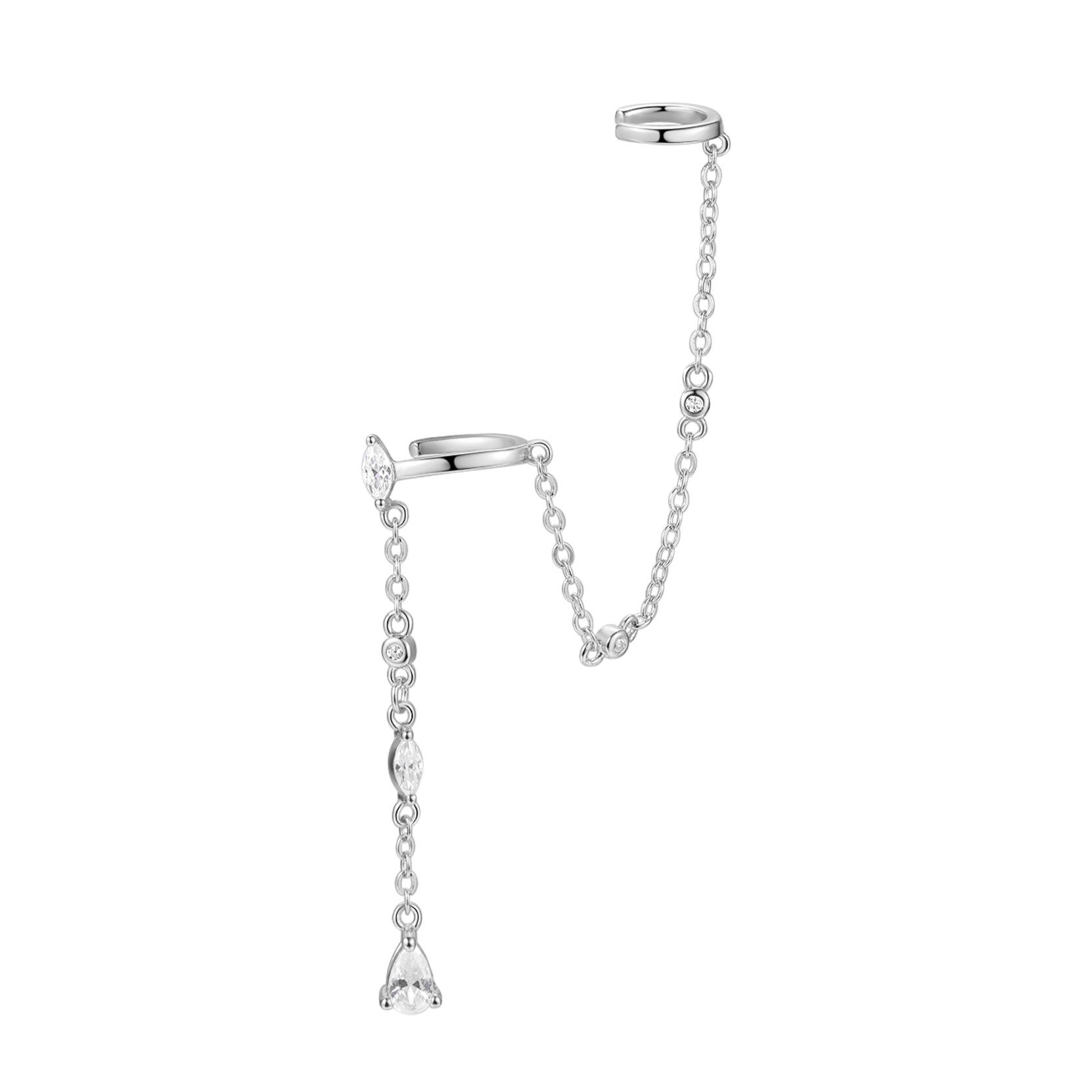 This ear cuff is made from 18 karat gold-plated sterling silver and consists of a collection of six zirconia on a fine gold chain, one which acts as a stud earring, fastening to the earlobe with a butterfly clasp, and two metal cuffs which attach to the ear. A delicate, romantic design that will instantly update your outfit. Also, check out Radiant Drop Earrings Sterling Silver Gold.
