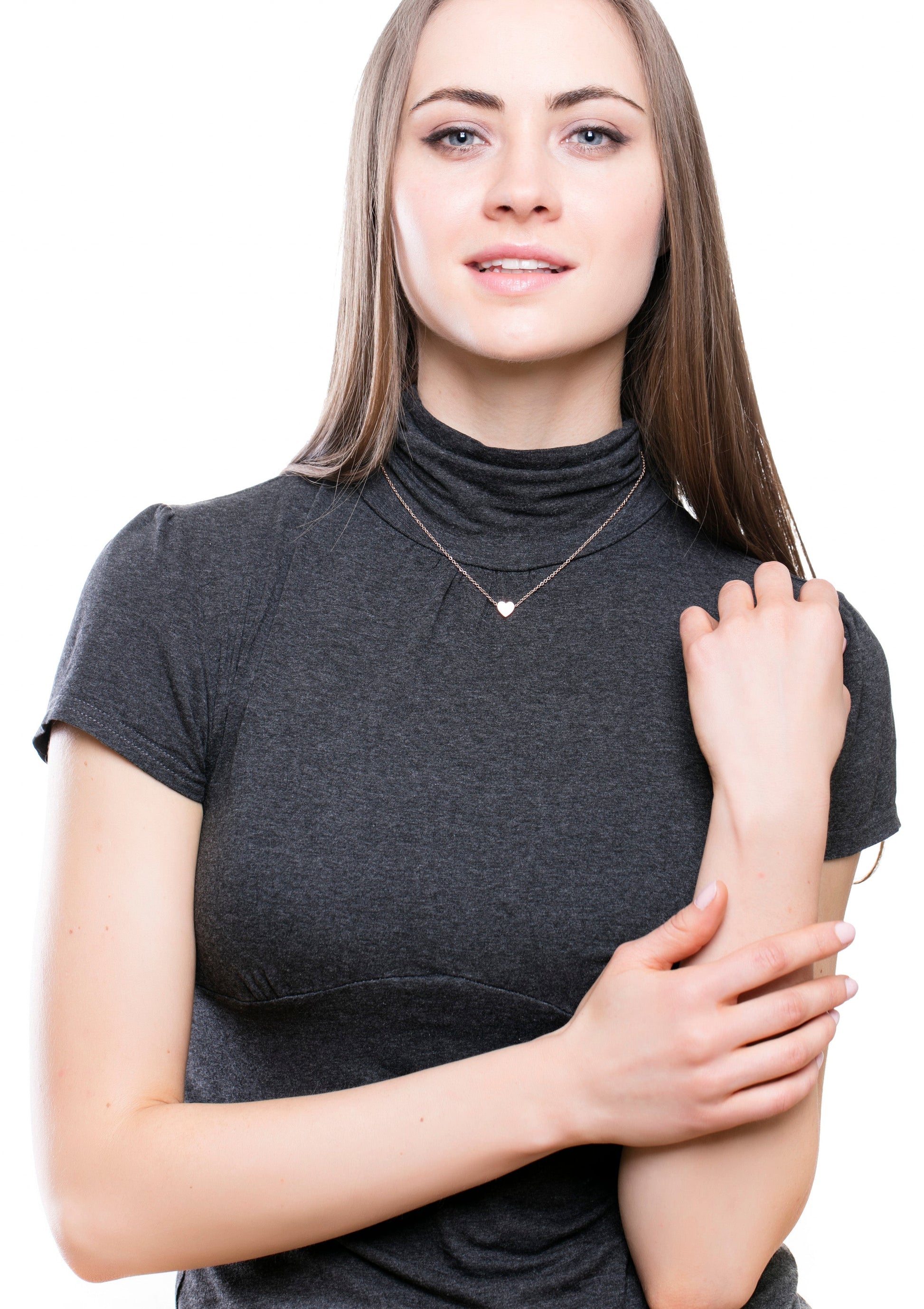 This necklace has a mid-length fine chain with a rounded sweetheart pendant hanging in the middle. The cute, simple design is great to wear with high necklines, or simple cotton tank tops. Also, check out Heart Pendant Necklace Gold.