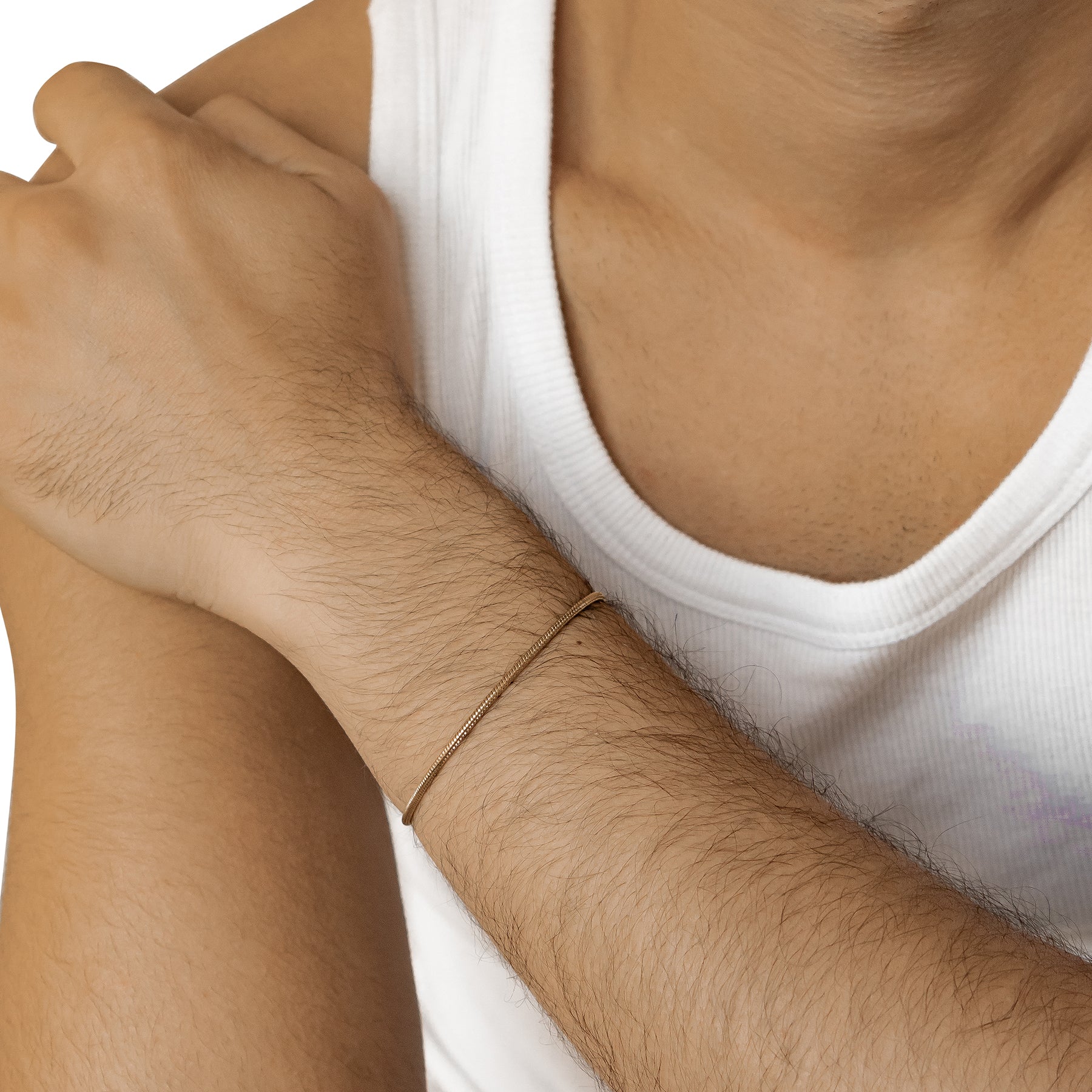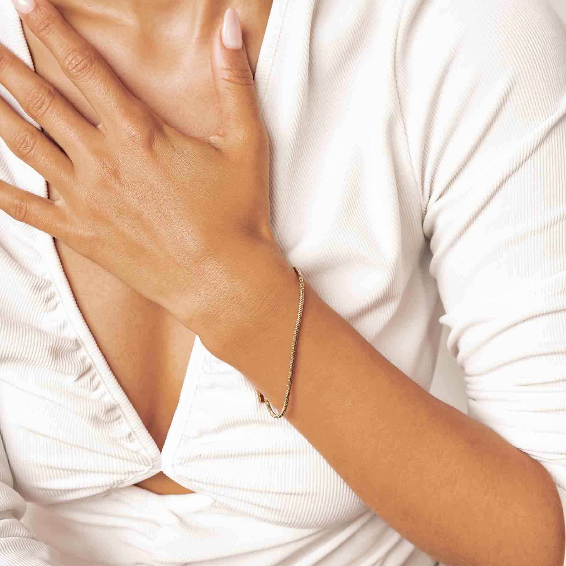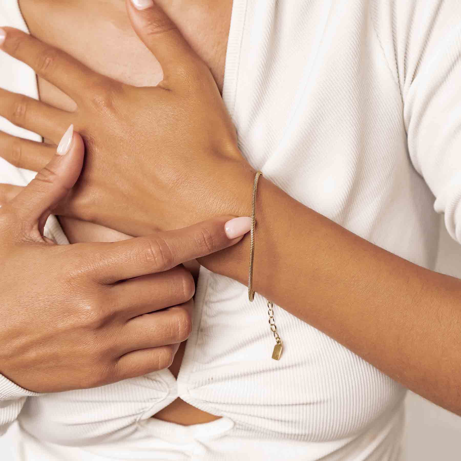 A rounded ‘snake’ chain bracelet, made from stainless steel, coated in 18 karat gold, and finished with crimp ends. It fastens together with an oval-shaped ‘lobster claw’ clasp and has a short extension chain with a signature Hey Happiness shell pendant for an adjustable fit. A strong, flexible, and very versatile piece. Also, check out Snake Chain Bracelet Gold.