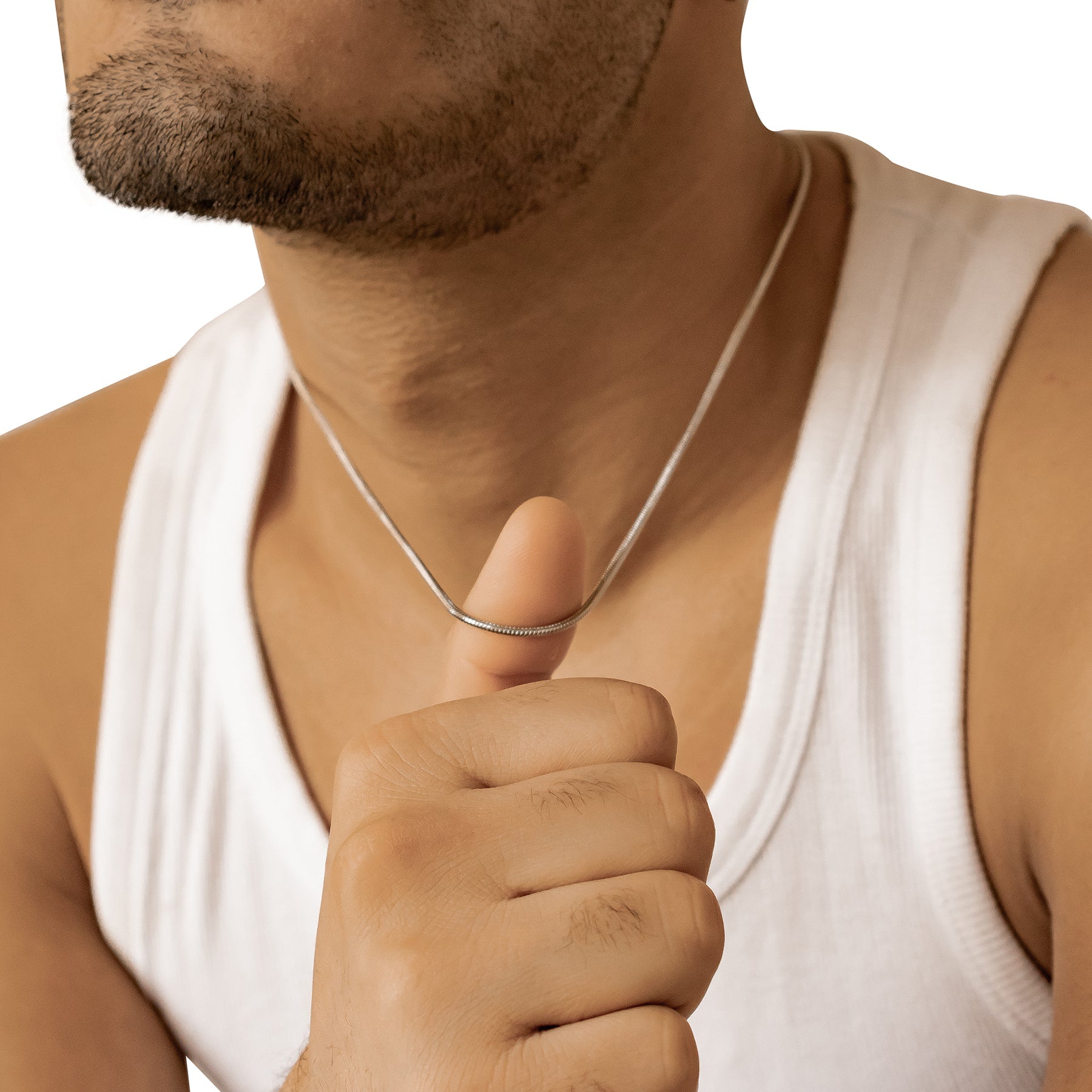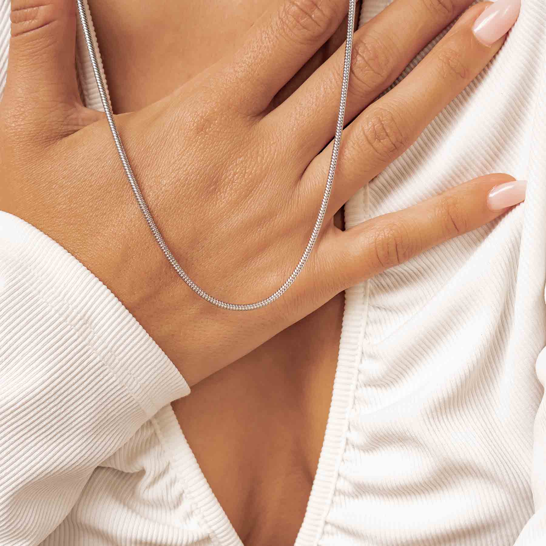 A sterling silver ‘snake’ chain necklace made from rounded, tightly interlocking, metal plates and crimp ends, which fasten together at the center back with an oval-shaped ‘lobster claw’ clasp. It also has a short extension chain made from regular-shaped chain links, with a small, flat shell charm hanging at the end. Adjustable and versatile, this necklace can be worn together with pendants, alone, or layered with other chain necklaces. Also, check out Snake Chain Necklace Silver.