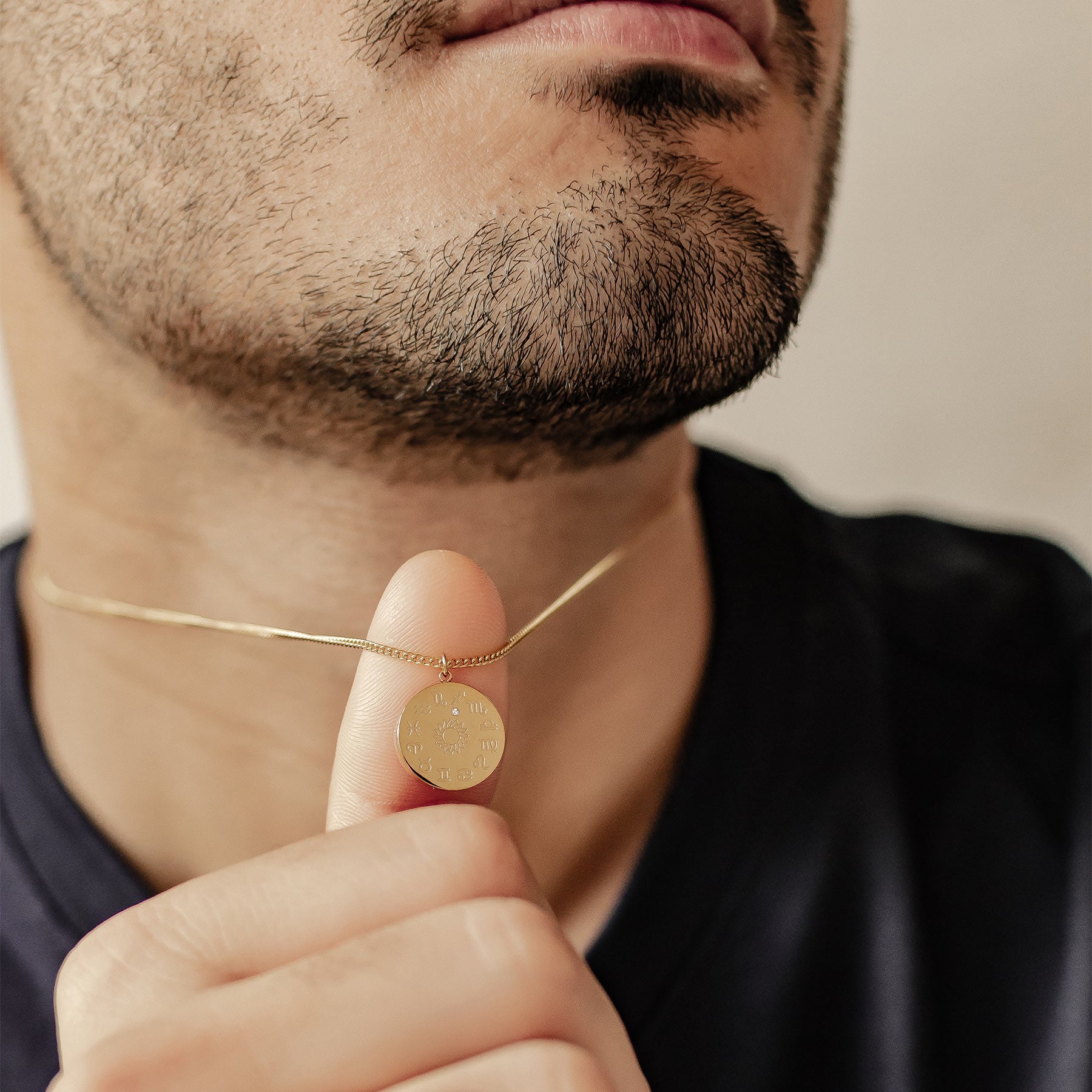 This is a round necklace pendant that features two harmonious designs on either side: on one side it has a tiny moon and star and a cluster of zirconia stones arranged in Sagittarius’ star constellation, while on the other side, it has the full set of 12 zodiac signs placed around a central sun, with a zirconia pointing to Sagittarius. This unique piece is inspired by the dynamism of Sagittarius; a unique blend of passion, curiosity and adventure with practical independence and adaptability.