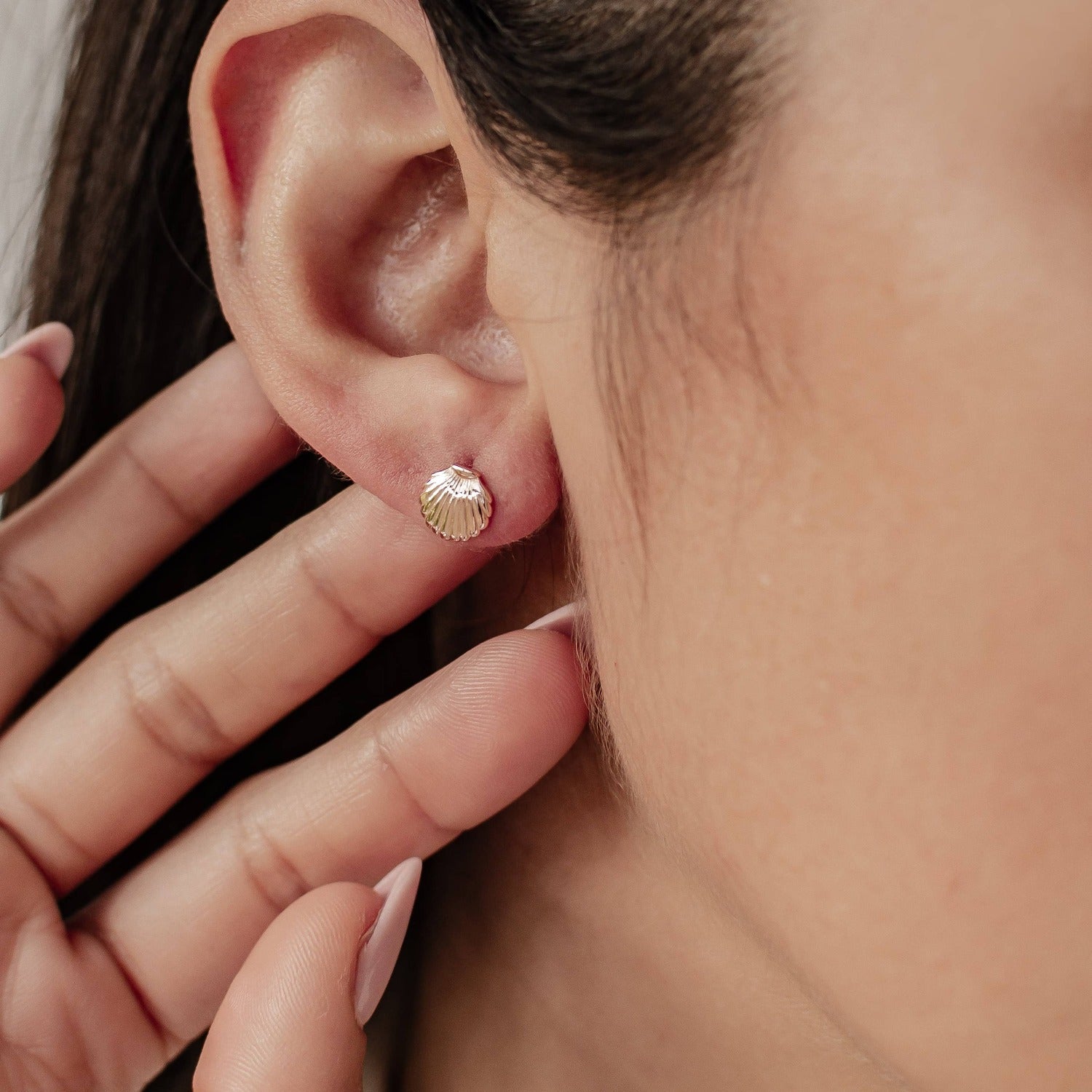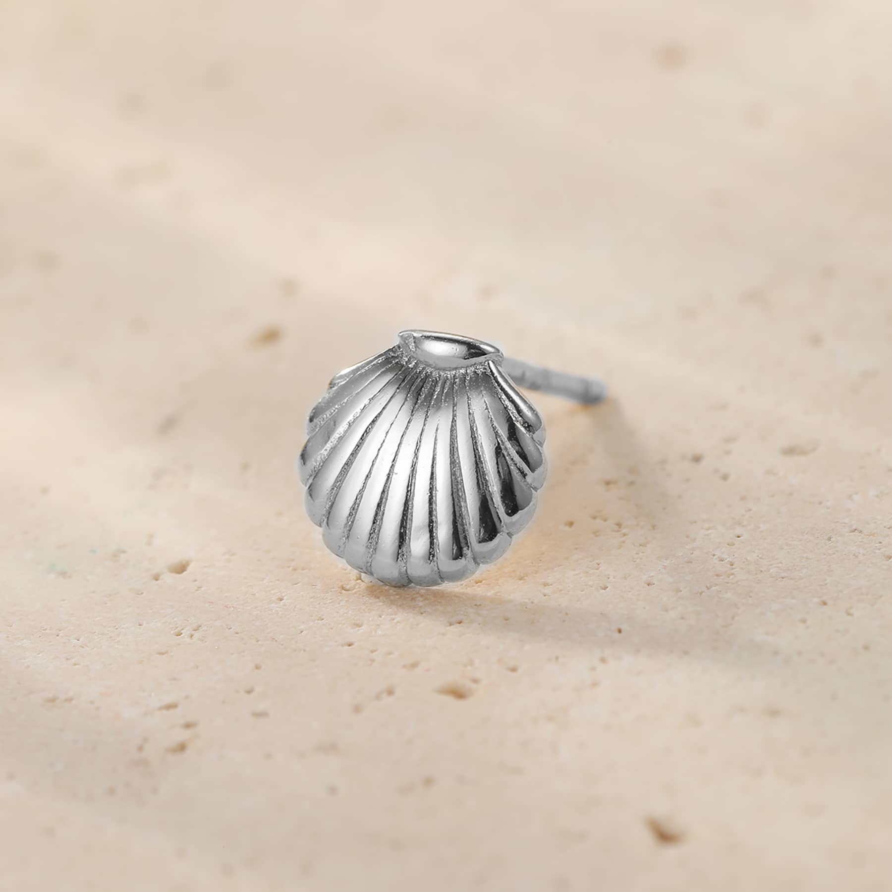 A gently curved scallop shell made from sterling silver, and with a polished surface, rounded edges and tiny engraved lines to accentuate its graceful shape. Add a touch of seaside elegance to your ear stack with this stud. Available as a single earring only, and in three colors: 925 sterling silver, 18 karat gold-plated sterling silver, and rose gold-plated sterling silver.