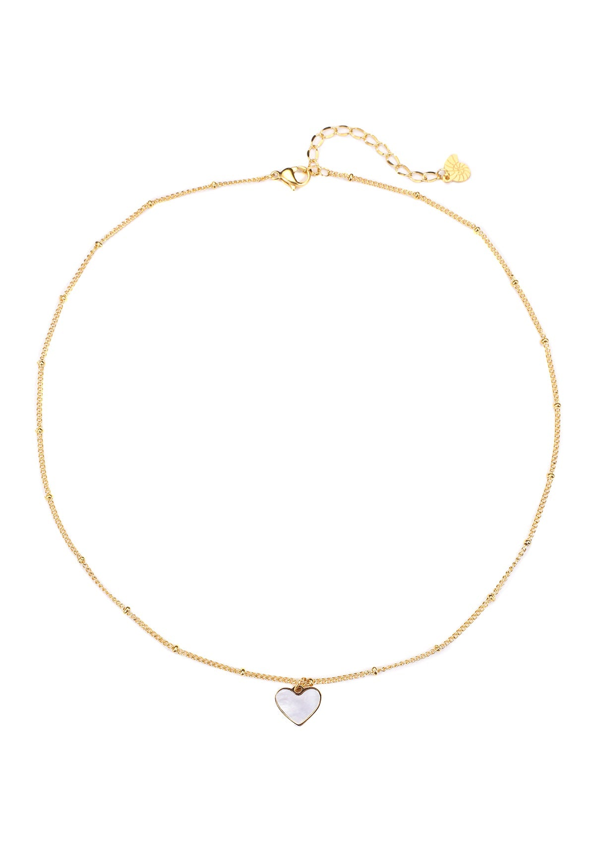 This is a delicate chain necklace made from 18 karat gold-plated stainless steel with a heart-shaped pendant and an iridescent shell insert hanging from the center front, and small metal beads dotted all the way along the chain. An oval-shaped lobster clasp fastens the chain at the back, where it also has a short extension chain (with a flat shell charm attached to the very end) which makes the whole necklace adjustable. Feminine and modern, this is an ideal necklace to wear on a daily basis, with casual outfits. Also check out Heart Pendant Necklace Gold.