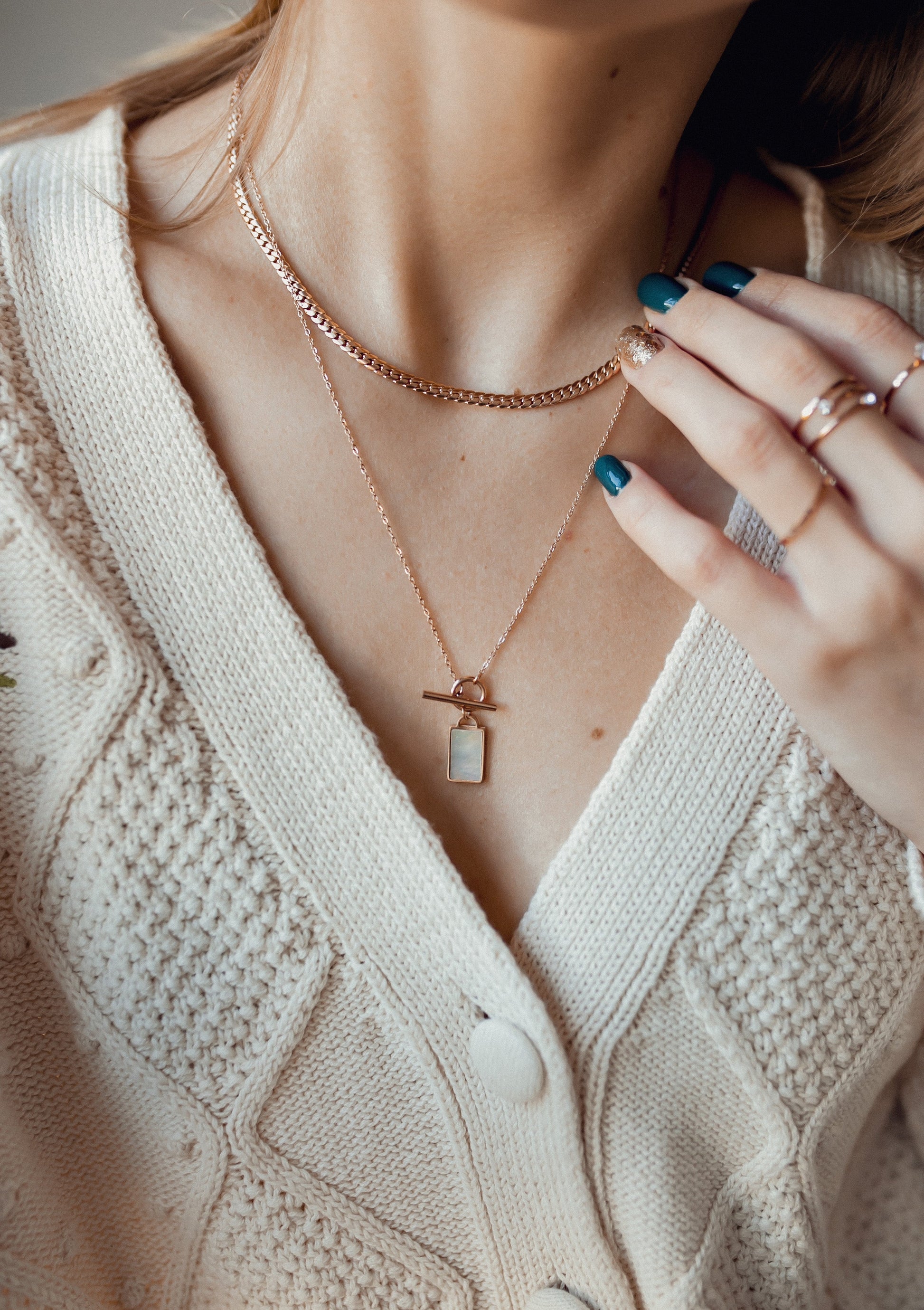 This rose gold-plated stainless steel necklace consists of a fine chain, a decorative, t-bar clasp which fastens the chain together at the center front, and a shell-plated rectangular pendant hanging underneath the clasp. The chain measures 56.5 cm, meaning this necklace is an ideal addition to a set of layering necklaces. Modern, elegant, and versatile, this is a piece that you will be reaching for again and again. Also check out Heart Charm T-Bar Chain Necklace Rose Gold.