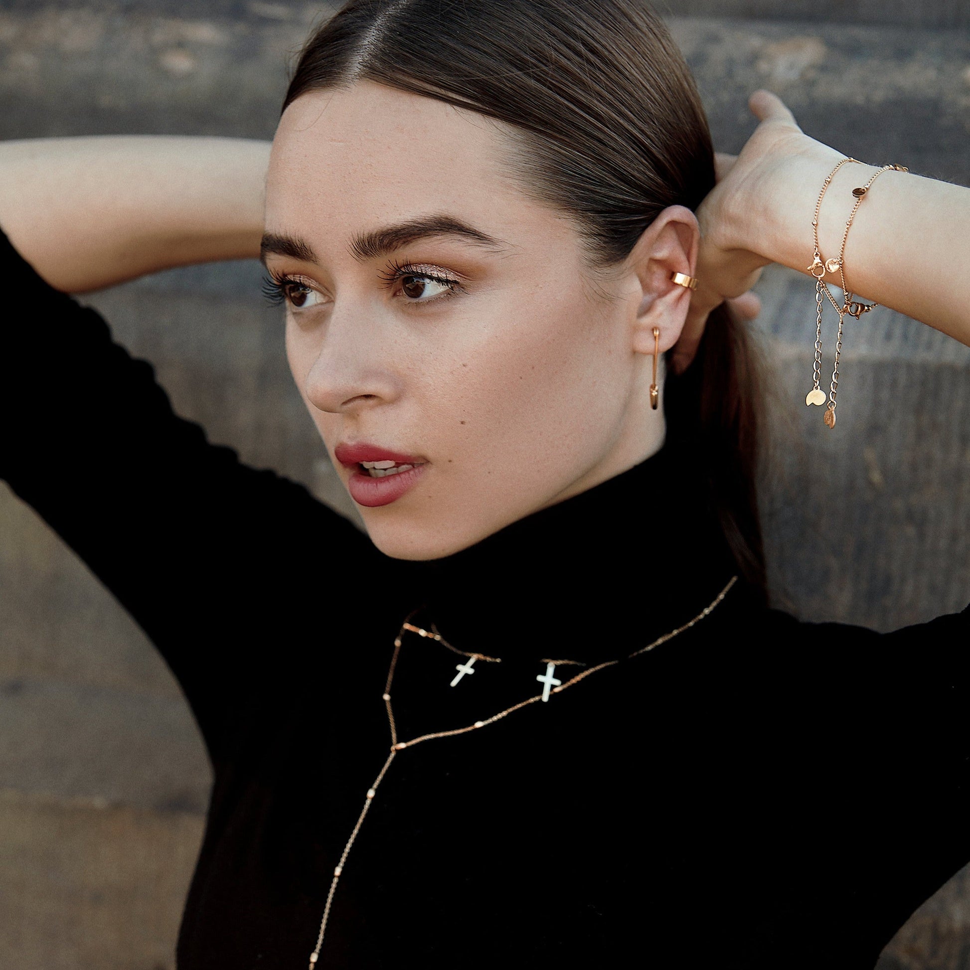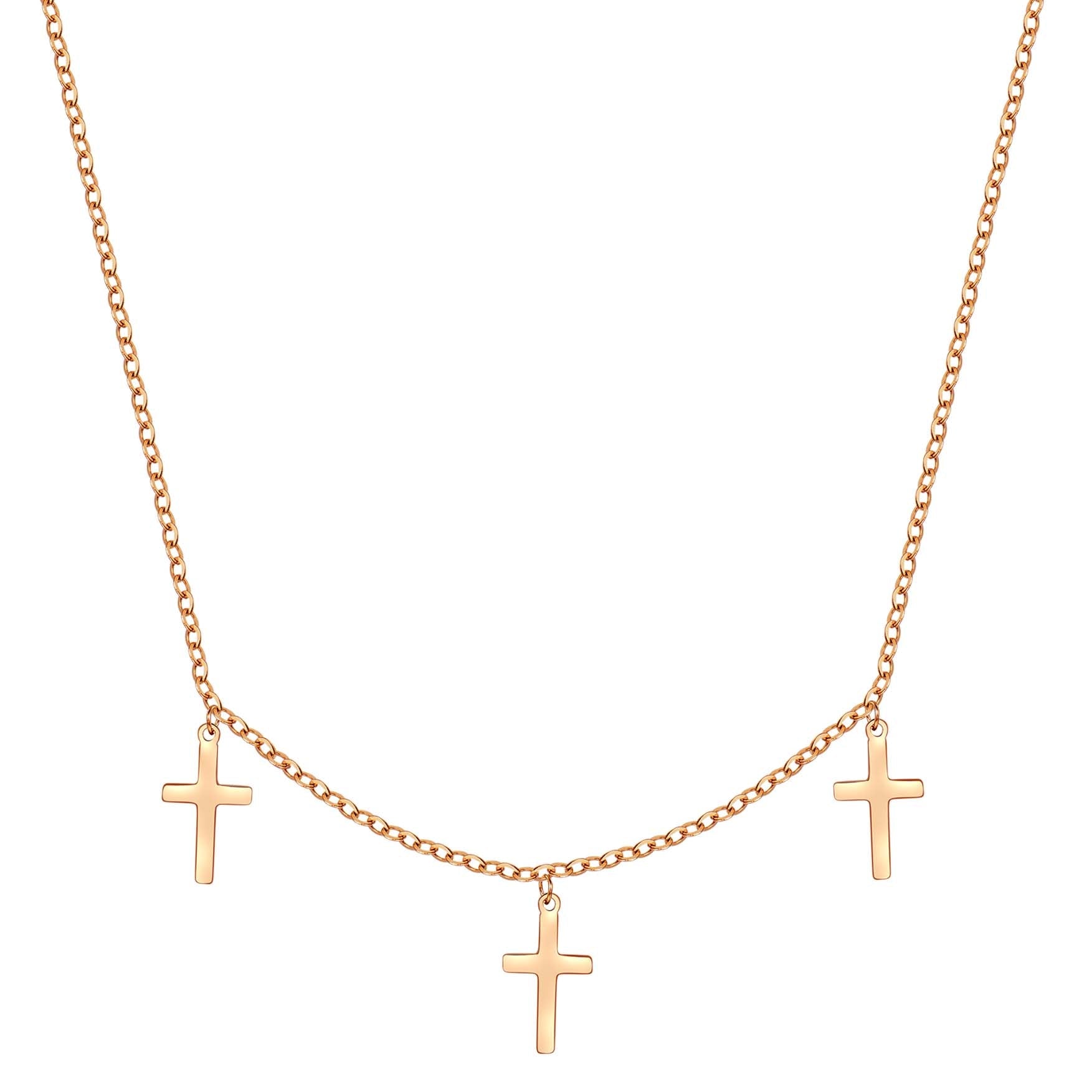 This is a thin, delicate chain necklace made from stainless steel with rose gold plating which has three small, flat cross pendants hanging from the front of it, all at even spaces. A rose gold spring clasp closes the chain at the center back, along with a separate length of chain (made from larger links and with a small, shell pendant hanging from the end), which makes the overall fit adjustable. Timeless, stylish and easy to wear, this is a necklace that will suit a number of looks—from button up blouses at the office, to billowy dresses on your next summer vacation. Also check out Small Cross Necklace Gold and Small Cross Necklace Silver.