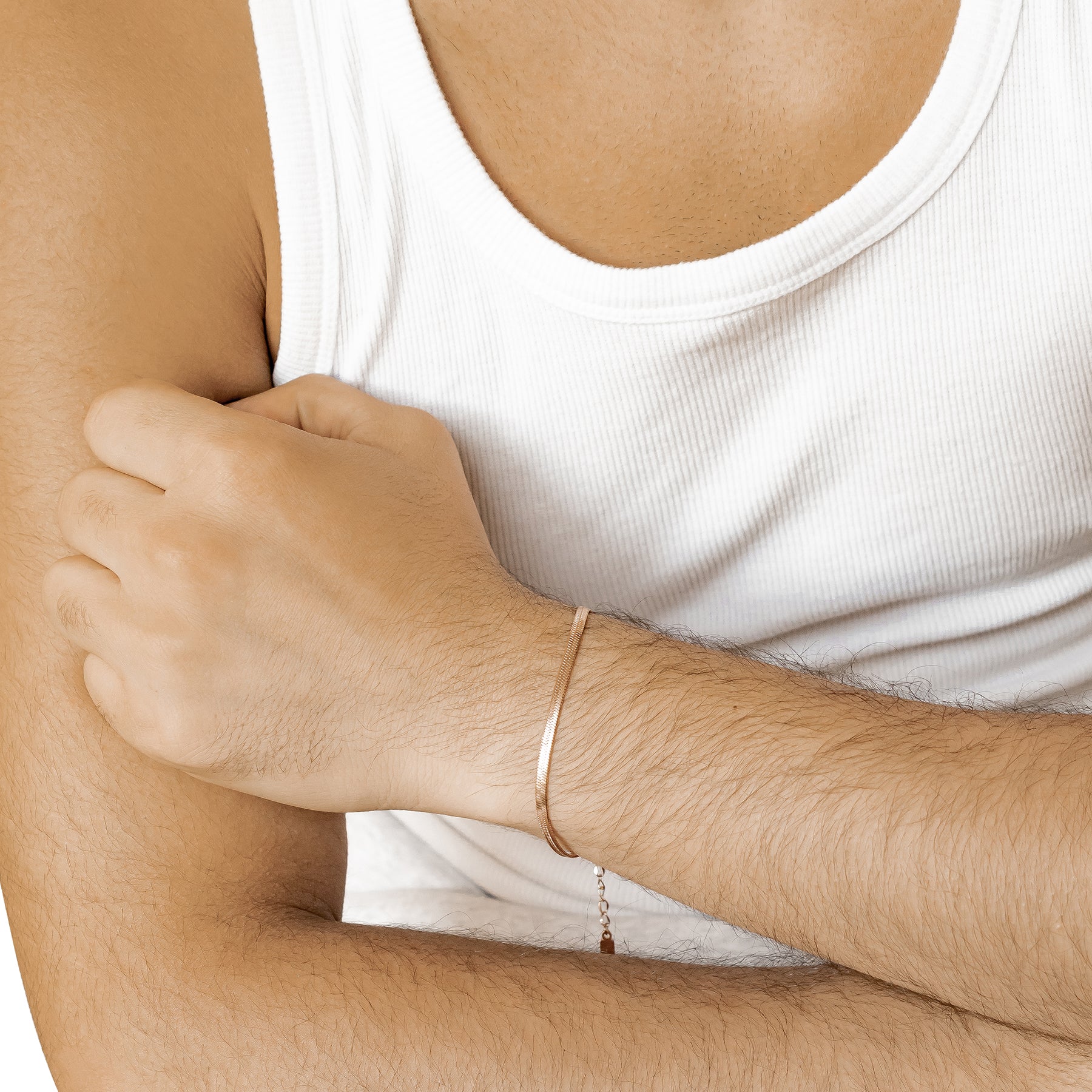 This snake chain bracelet is made from rose gold-plated stainless steel and features closely interlocking flat chain links, which form a flexible chain and resemble a snake’s skin. Two smooth pieces of hardware and circle chain links complete the chain at either end, where it closes with an oval-shaped spring clasp and a short extension chain (made from regular chain links). It also has a small, flat seashell pendant attached to one end of the chain. Simple, stylish and versatile, this bracelet can be worn with anything from casual dresses to tailored pant suits—a must have for every wardrobe. Also check out Snake Chain Bracelet Silver.