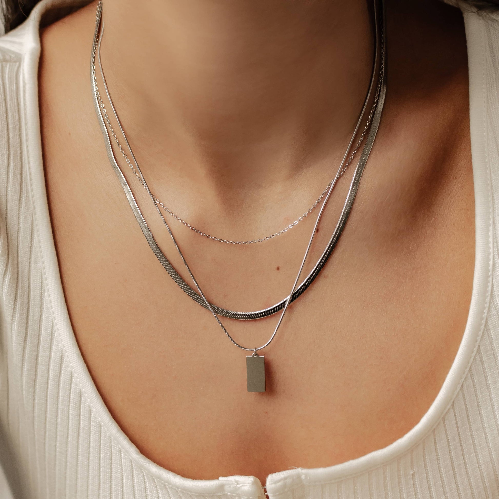 - A smooth, unembellished rectangular pendant hanging from a snake chain, which looks more tubular than your usual cable chain or link chain.