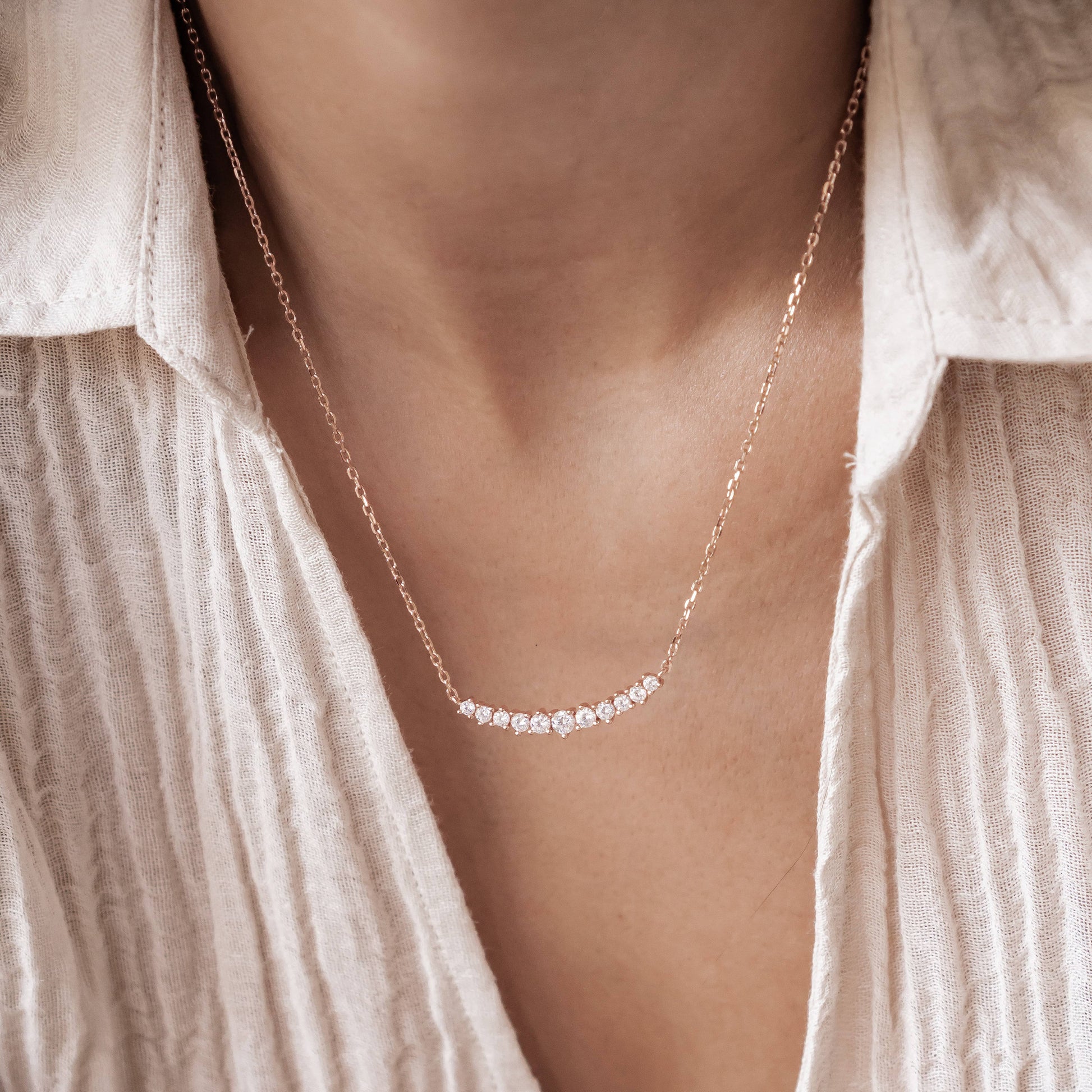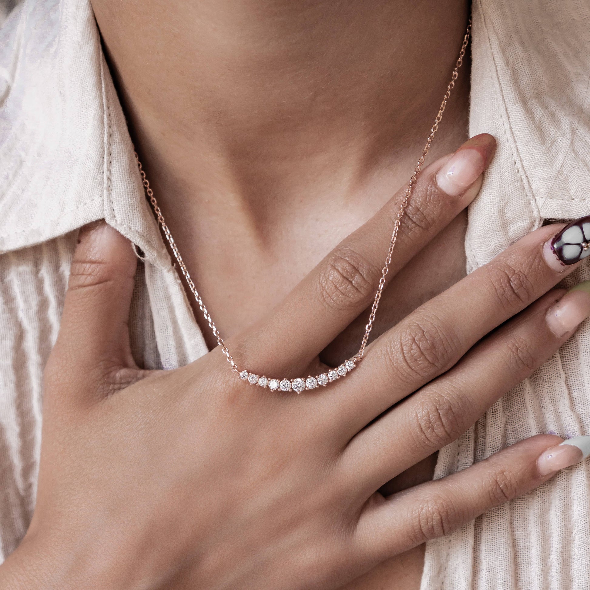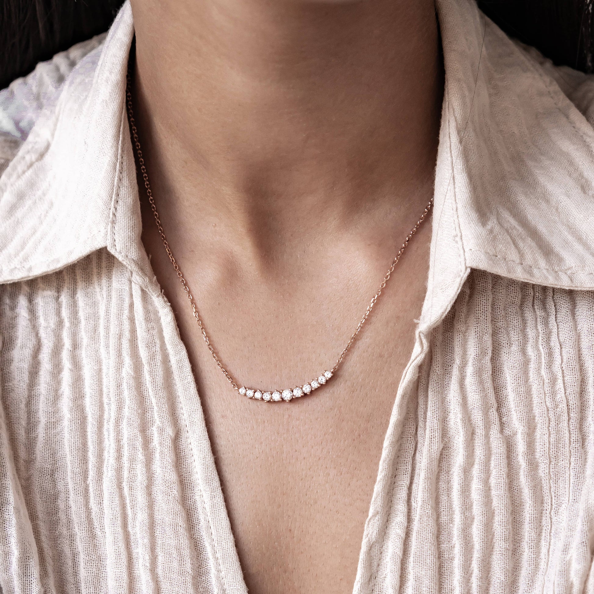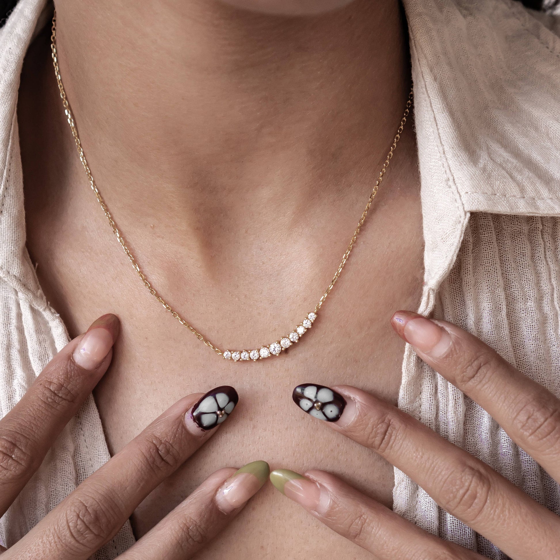 Effortless shine with timeless appeal. This tennis-style necklace features a graceful line of shimmering stones that catch the light from every angle. A go-to piece for adding elegance to your everyday looks. Available in gold, rose gold, and silver.