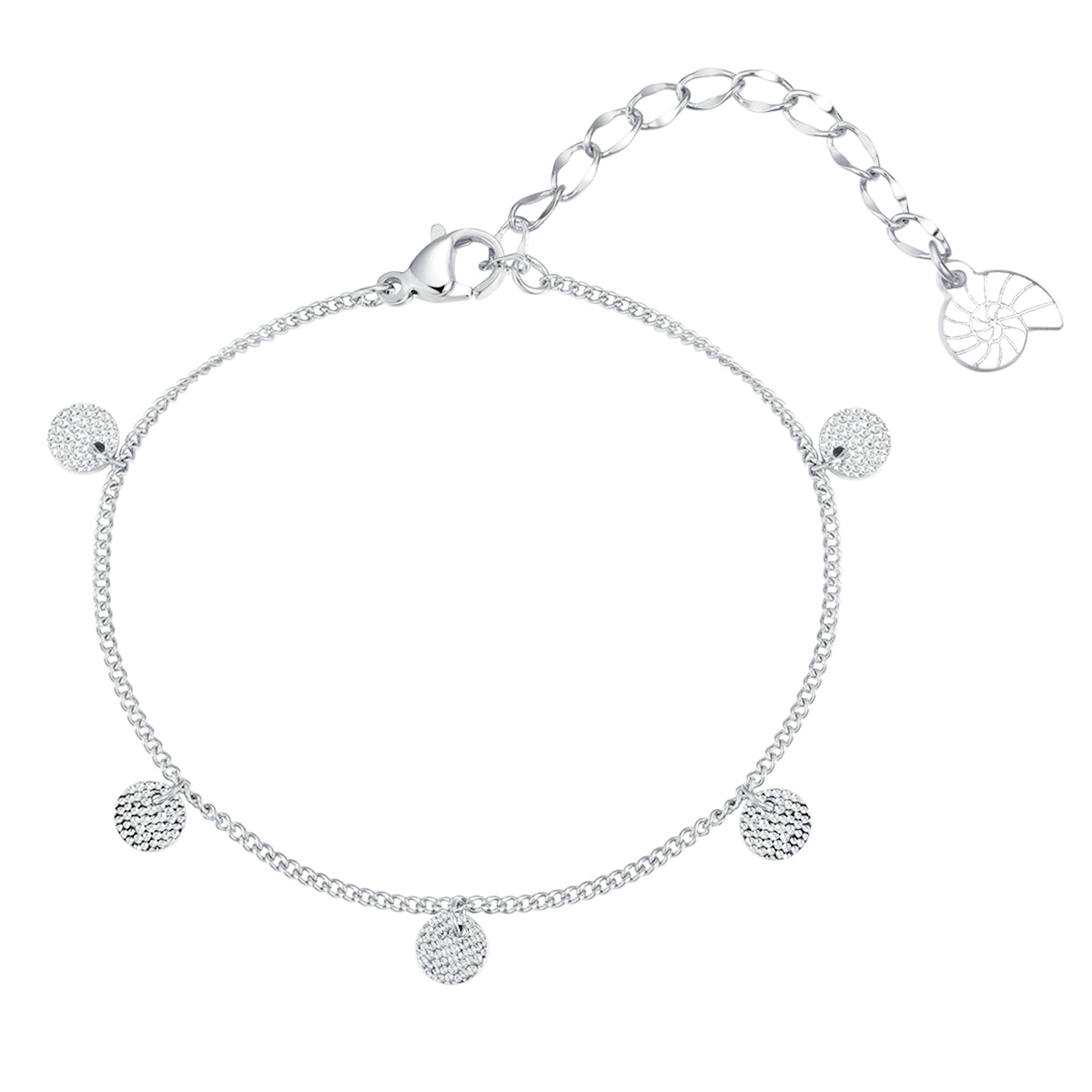 Made completely from stainless steel, this chain bracelet features a thin, ‘curb style’ chain and five small, round, textured pendants attached to it at even intervals. It fastens together with a lobster claw clasp, where it also has another, short length of chain (and a small seashell charm at its end) which means each wearer can adjust the fit to suit them. A dainty, yet very chic bracelet, this will pair well with both a romantic, flouncy style and a minimalist aesthetic. Also check out Circles Bobble Chain Bracelet Silver.