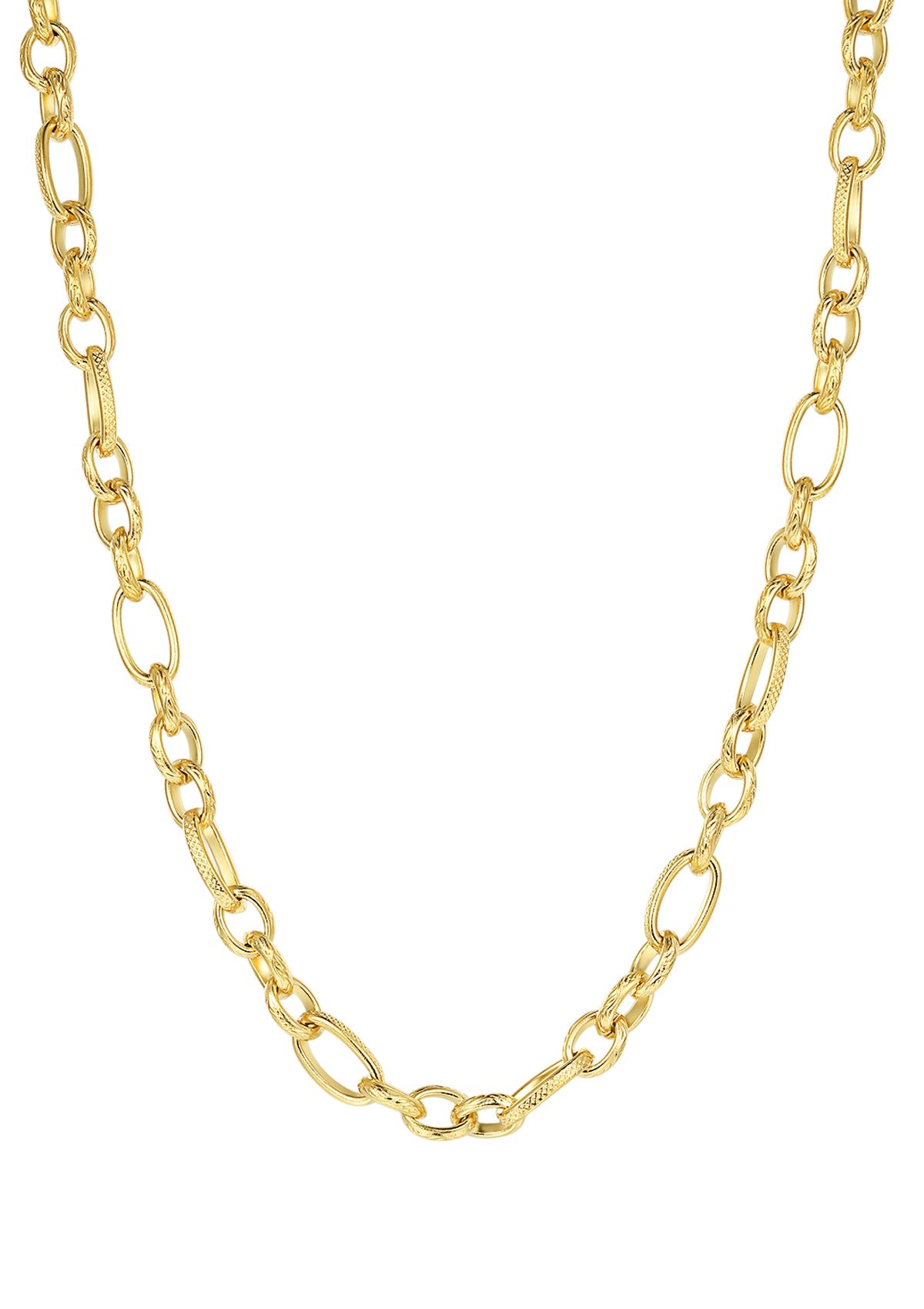 - a Figaro-style chain necklace made from round and oval-shaped chain links, which closes with a lobster claw clasp and extension chain, with a small shell charm at its very end, and