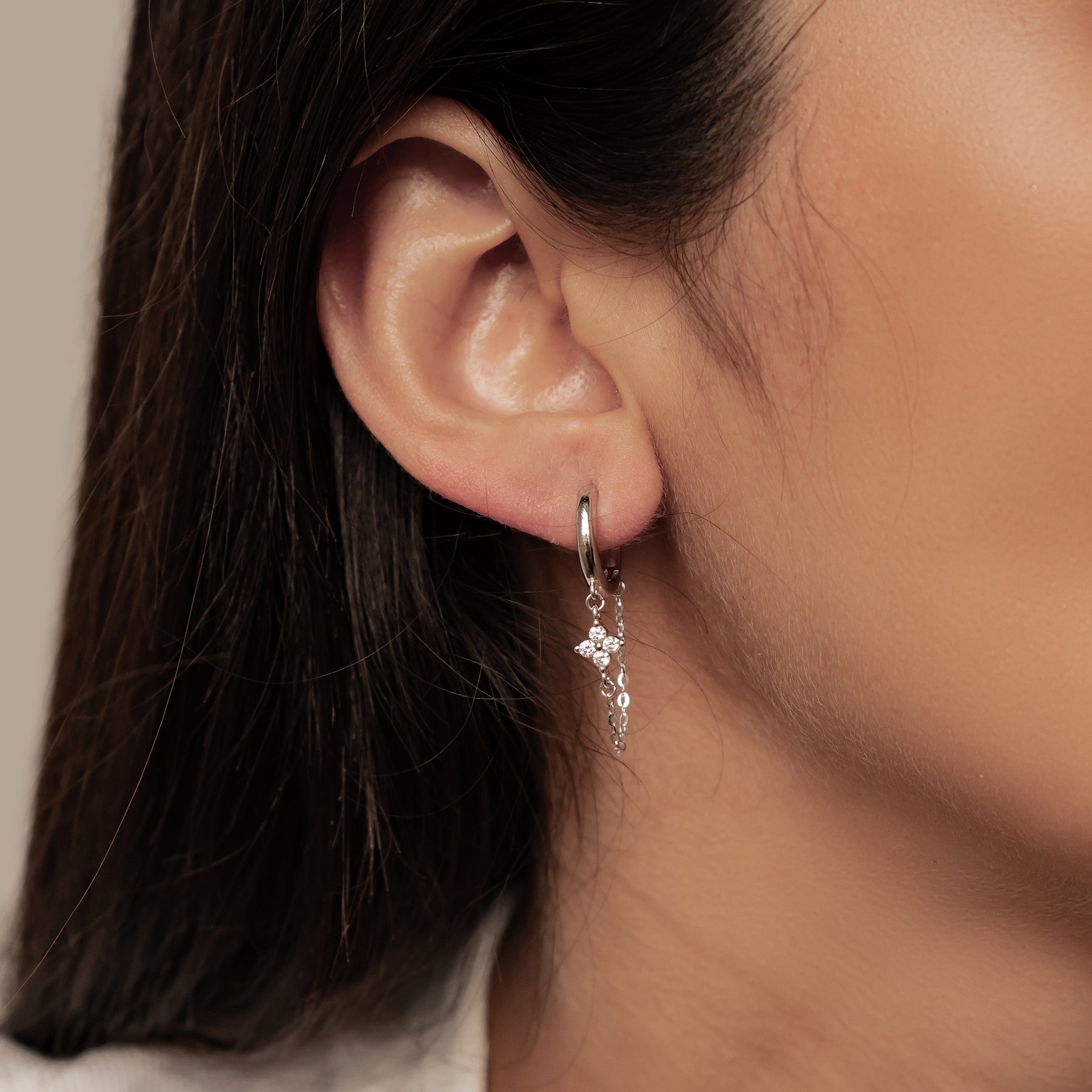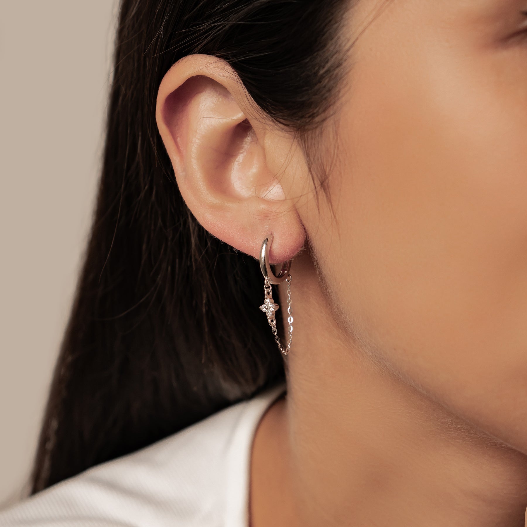 A minimalist hoop meets a sparkling floral charm, linked by a fine chain that adds soft movement and shine. Elegant and versatile, they’re crafted from 925 sterling silver and come in three colours — gold, rose gold, and silver — perfect for stacking or wearing solo.
