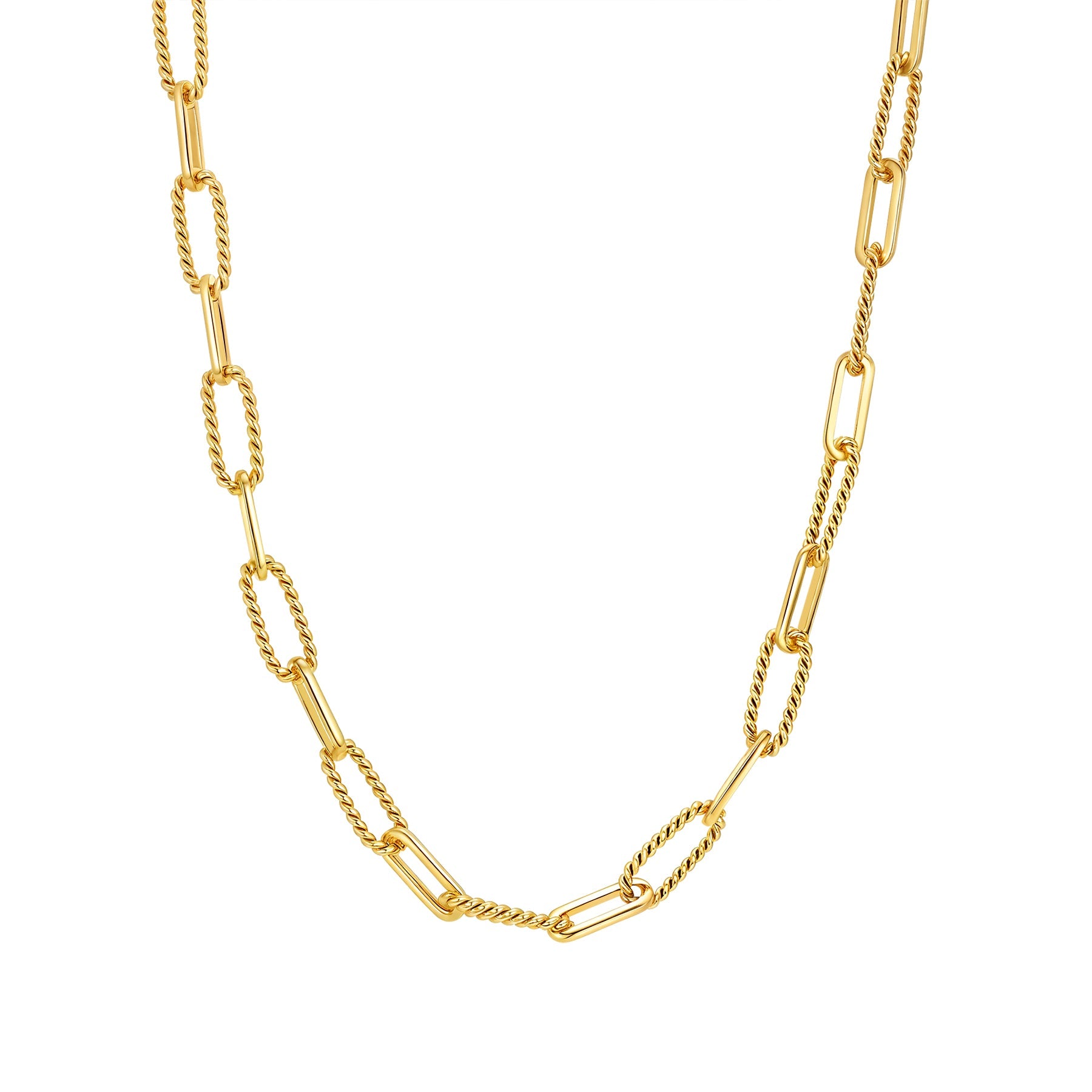 A fresh twist on a favorite – this paperclip chain alternates between twisted and smooth links for added dimension. Made from stainless steel, waterproof, and available in gold, rose gold, and silver for effortless styling.