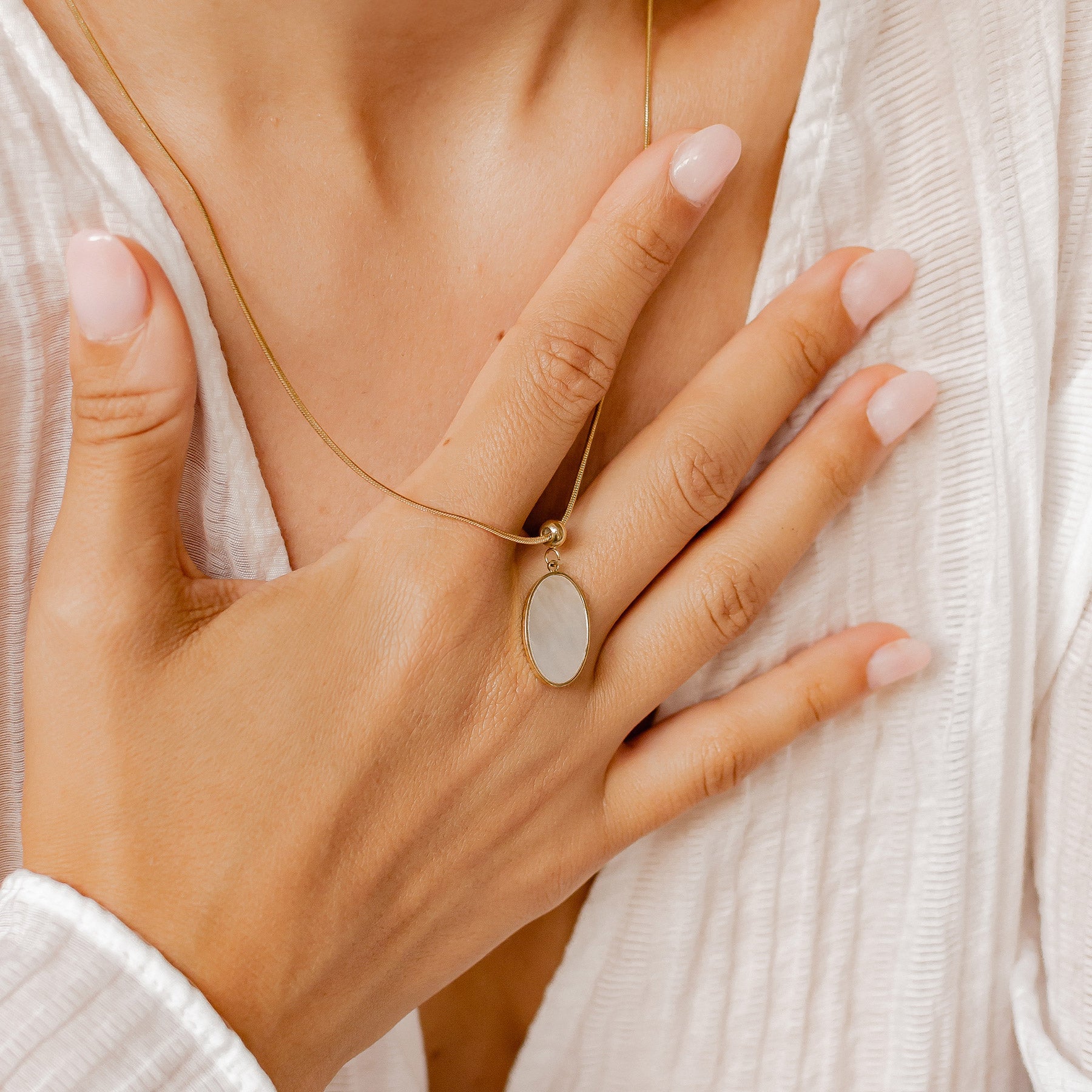 Made from stainless steel, this is an oval-shaped pendant with an iridescent shell inlay and a small metallic bead that threads it onto your necklace. Inside the bead is a thin layer of anti-slip silicone which ensures the pendant stays in place while being worn. An ideal, everyday piece that can be mixed and matched with any of our plain necklaces, especially our larger unisex chains.