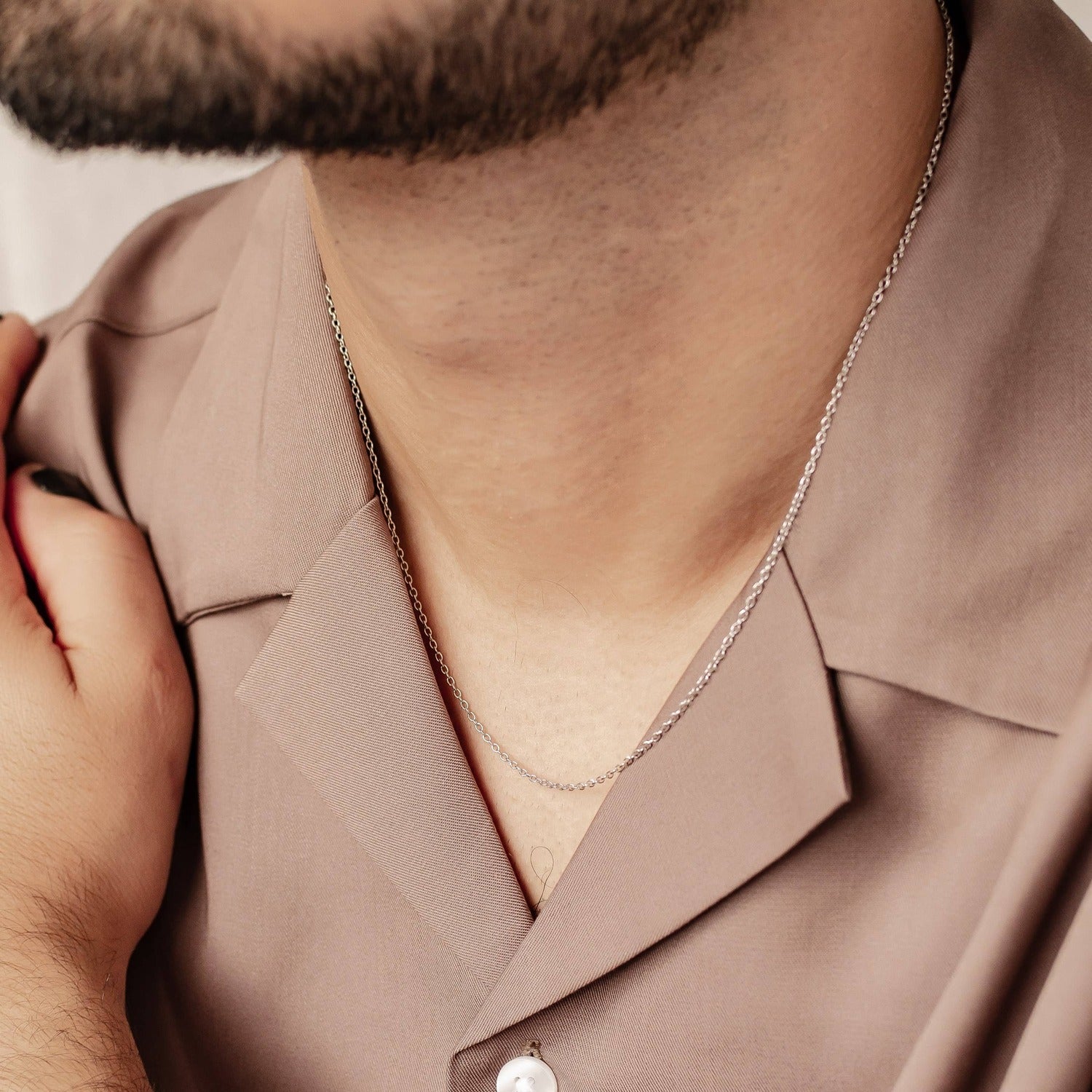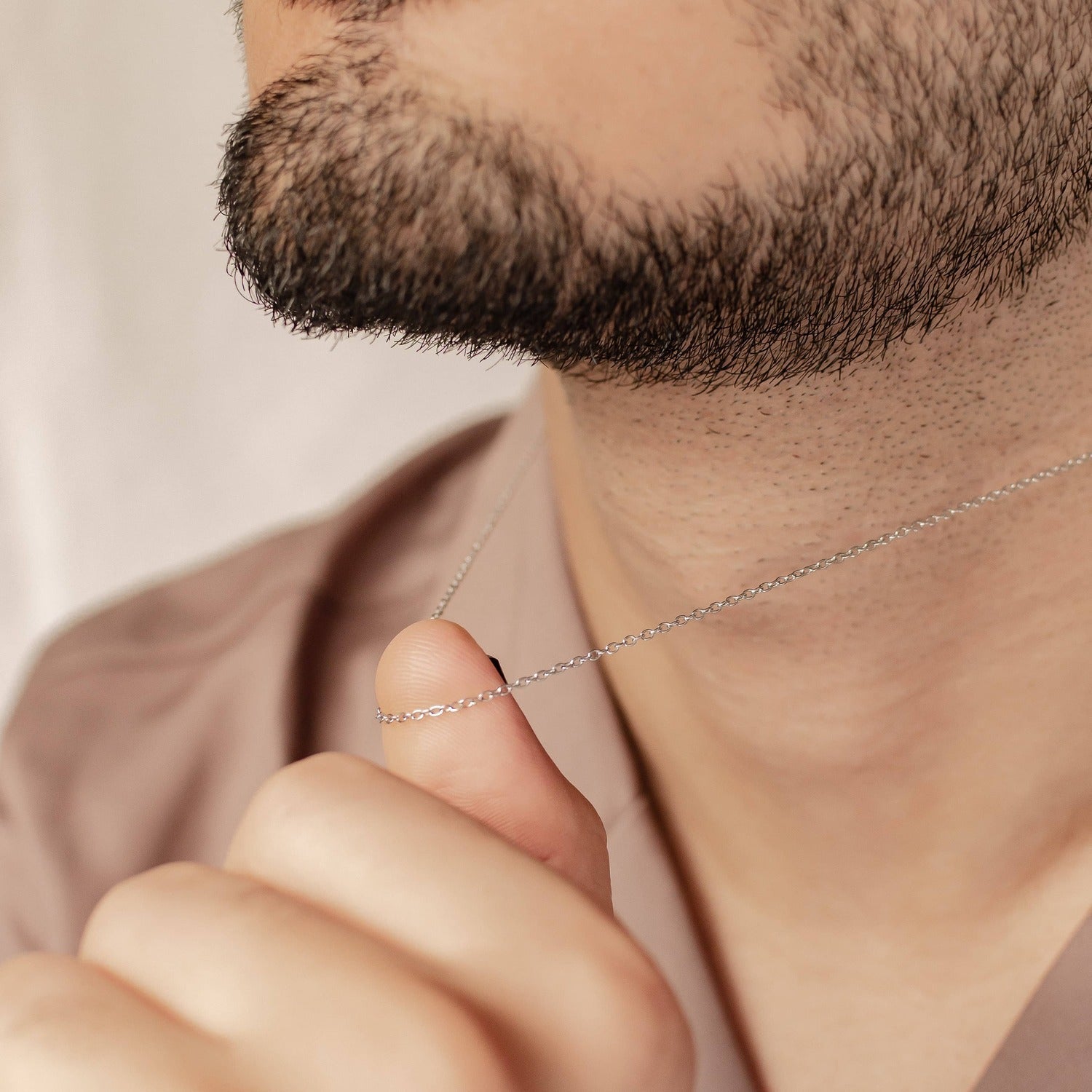 A classic cable chain necklace made from stainless steel that consists of tiny rounded links all connected together. It fastens at the center back with an innovative sliding clasp that sees one chain end threaded through a rounded bead on the other end and held securely in place. A timeless and versatile piece that can be worn by both men and women and that is ideal for pendants.