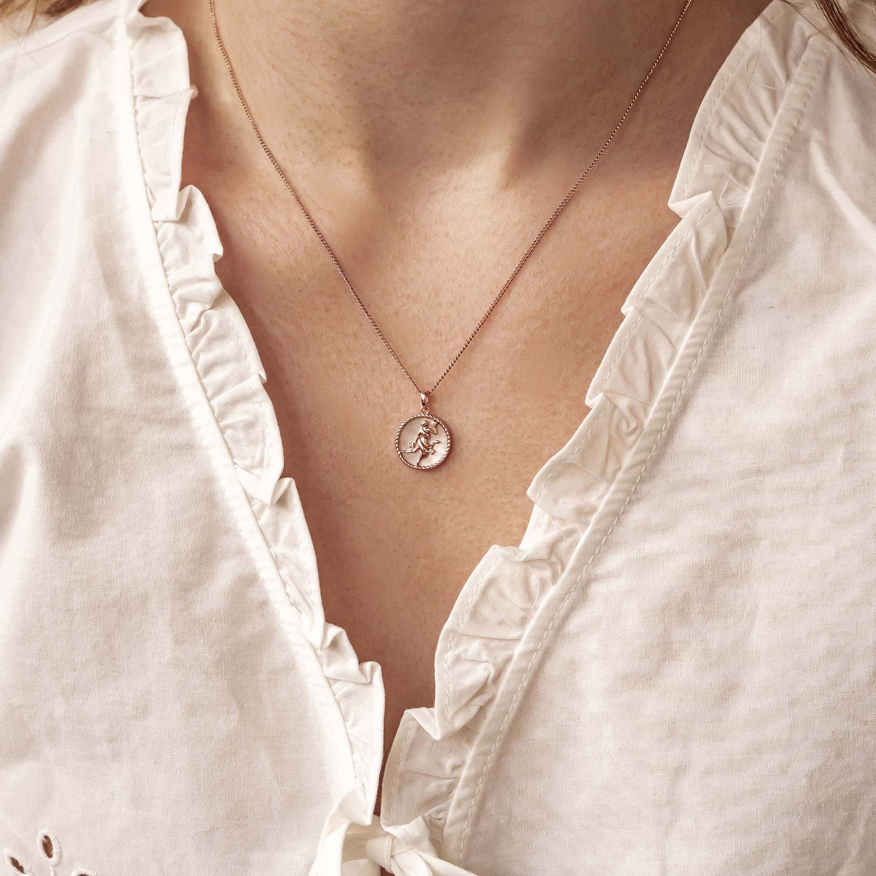 This is an elegant necklace consisting of a classic, adjustable chain with spring clasp, and a detachable round pendant depicting a graceful figure draped with cloth and three tiny round, glistening zirconia stones in the middle of it. You choose whether to purchase the pendant on its own, or together with its matching chain. A gentle piece perfect for our loyal, organised and analytical Virgo, this pendant bears the reminder: “The magic lies in the details. Don’t be afraid to strive for perfection.”