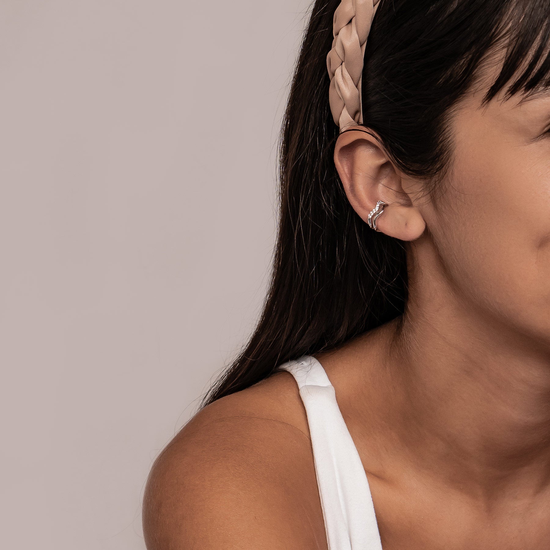 Make a statement with our Twin Sparkle Double Band Ear Cuff. Expertly crafted from 925 sterling silver and available in gold, rose gold, or classic silver, this bold cuff features a wavy double-band design with one row pavé-set in shimmering cubic zirconia. Comfortable and secure without requiring a piercing, it’s the perfect piece to bring texture, shine, and a modern twist to your ear stack.