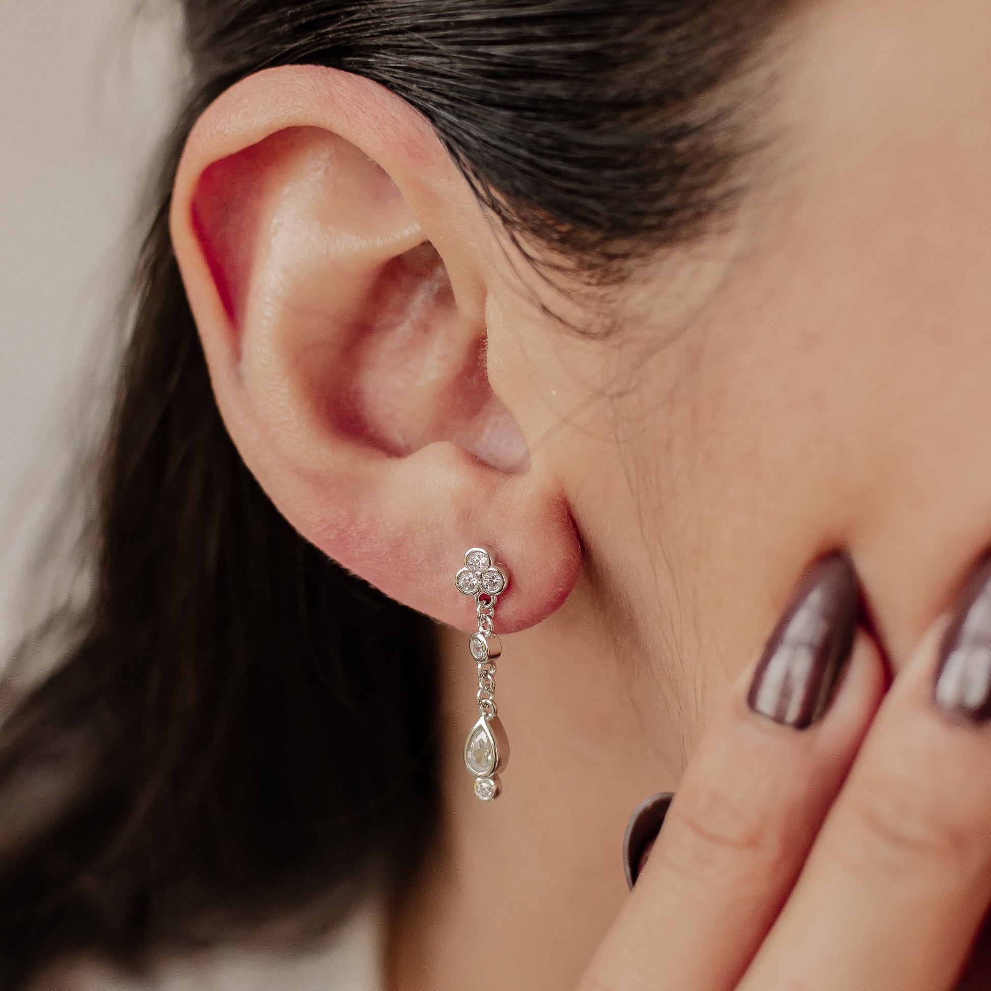 Crafted in shimmering sterling silver, these White Triad Drop Stud Earrings will add a touch of elegance to any outfit. This stunning stud earring showcases a brilliant white triad design as mains stud, accented by three sparkling zirconia gemstones that hang from it. Available in both gold and silver, these earrings make the perfect addition to any jewelry collection.